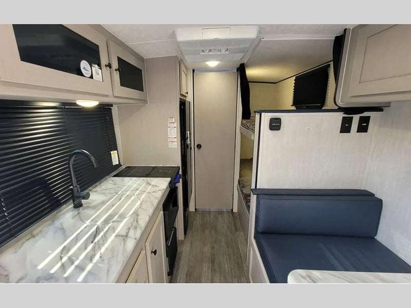 Sleeps 5 Length 20 ft 8 in Ext Width 7 ft Ext Height 10 ft 2 in Hitch Weight 416 lbs GVWR 4500 lbs Dry Weight 3196 lbs Cargo Capacity 1304 lbs Fresh Water Capacity 52 gals Grey Water Capacity 35 gals Black Water Capacity 35 gals Tire Size 16" Number Of Bunks 2 Available Beds Full Refrigerator Type Double Door Cooktop Burners 2 Shower Size 24" x 36" Number of Awnings 1 LP Tank Capacity 20 lbs. Water Heater Type Tankless AC BTU 15000 btu Awning Info 13' Power w/LED Light Axle Count 1 Number of LP Tanks 2 Shower Type Tub/Shower Combo Similar Floorplans