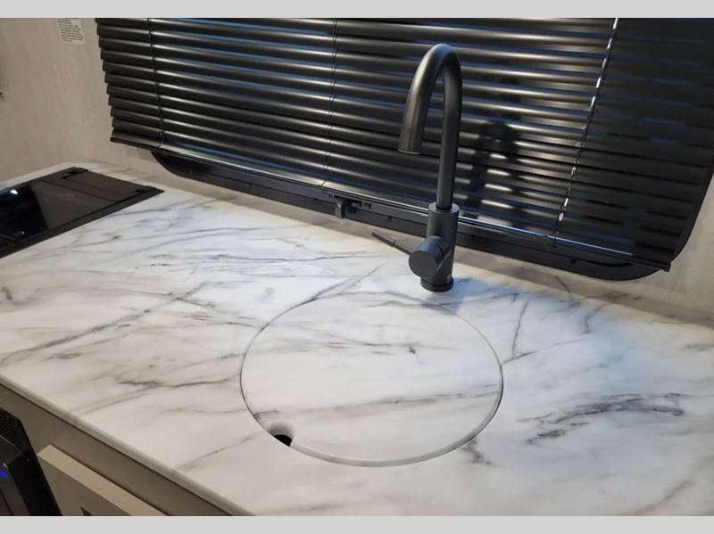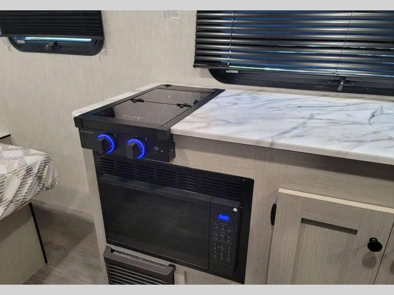 This cute, but mighty travel trailer features a true Aluma-cage construction with dual layer Azdel vacuum-bonded fiberglass exterior. The fiberglass front cap features LED lighting and a window for a great view of your surroundings. There is an insulated floor with seamless decking, four stabilizer jacks to make setup super easy in camp, a quick disconnect LP hook-up for convenience, as well as an outside shower. Plenty of storage can be found both inside and out with magnetic baggage door catches to keep things secure. You will also appreciate the power awning with LED light, and a cast iron griddle with mounted prep bar, plus more!