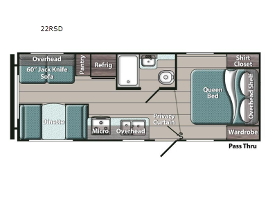 Get ready for relaxing camping trips in this travel trailer that can comfortably sleep four each night. The semi-private front bedroom includes a queen bed, a privacy curtain to enjoy your own space, plus a shirt closet and a wardrobe for storage. Your guests can sleep on the 60" jack knife sofa or booth dinette, and there is a full bath on board so everyone can freshen up before bed. The three burner cooktop and microwave oven will allow you to make a hearty breakfast in the morning, and you'll appreciate the 10.7 cu. ft. Everchill refrigerator/freezer for your perishables. There is also a pantry where you can store the snacks for those late-night cravings!