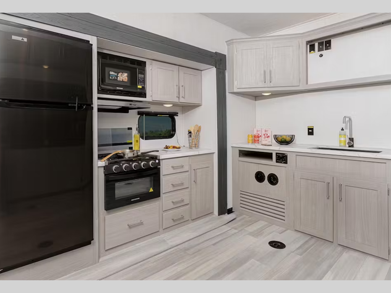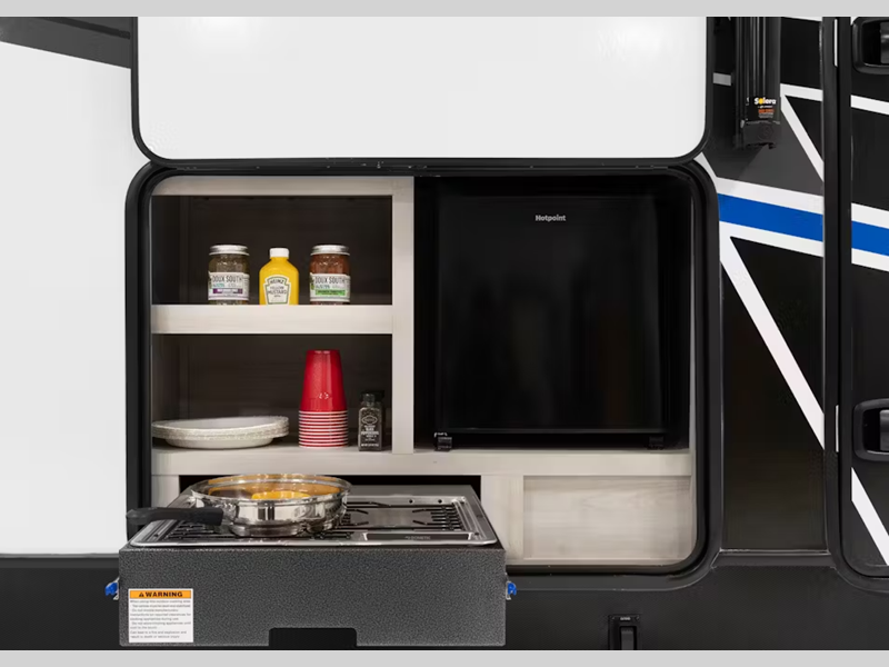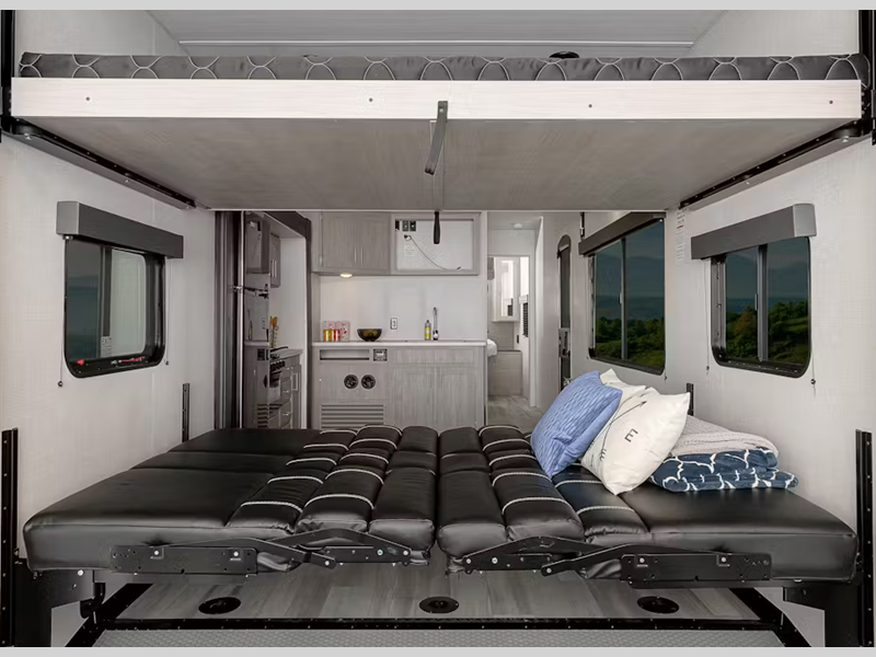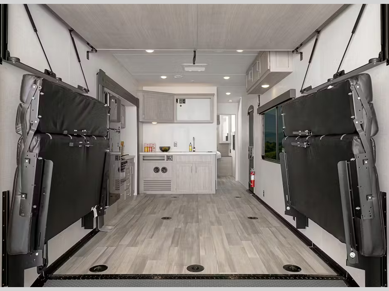 Each model features large tinted safety glass windows, furrion wireless backup camera prep, and a wide-body construction to fit your favorite toys on board. Inside, you will love 5K lbs. frame welded tie-downs, new larger shower, and 12V refrigerator. Also, check out the beautiful interior designs and additional sleeping space for guests!