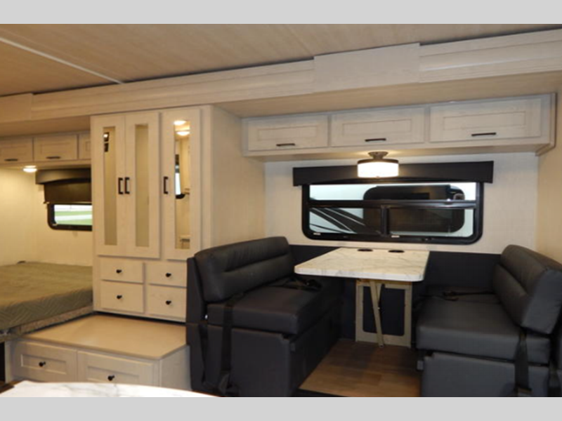 Sleeps 5 Slides 1 Length 31 ft 9 in Ext Width 8 ft 3 in Ext Height 10 ft 11 in Int Height 6 ft 10 in Interior Color Modern, Coastal, Adventure, Bourbon Exterior Color Charcoal, Azzuro, Rage Hitch Weight 7500 lbs GVWR 14500 lbs Fresh Water Capacity 40 gals Grey Water Capacity 28 gals Black Water Capacity 28 gals Furnace BTU 30000 btu Generator 4.9k Gas Fuel Type Gas Engine 7.3L V8 Chassis Ford E430 Fuel Capacity 55 gals Wheelbase 223 in Number Of Bunks 1 Refrigerator Type 12V Refrigerator Size 10 cu ft Cooktop Burners 3 Number of Awnings 1 Axle Weight Front 5000 lbs Axle Weight Rear 9600 lbs Water Heater Type On Demand AC BTU 13500 btu TV Info LR TV Awning Info Electric w/LED Lighting Gross Combined Weight 22000 lbs Shower Type Radius Similar Floorplans