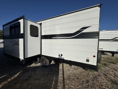 You'll feel right at home in this spacious travel trailer thanks to the large slide out, front bedroom, and full rear bath. There is a 24" x 40" tub, a toilet with partitions, and dual bath sinks with a mirror which allow you both to get ready for bed at once. The fully-equipped interior kitchen includes generous counter space to prep meals, and the outside kitchen will be perfect when the weather is nice. A large pantry will give you a place to store food, paper products, and more, plus this space is washer/dryer ready if you choose to add those appliances.